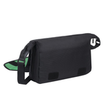 The multi-functional and stylish messenger bag is designed to fit an SLR camera with a zoom lens attached, along with other essential items. It provides flexibility for the traveler who needs to adapt to their carrying needs on the go. The voguish green interior lining, made from soft velour, protects the camera's LCD screen from scratches. The simple dark black exterior lining adds flair and uniqueness to the bag's design.