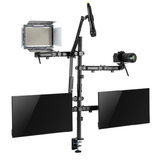 he MDS10-2 All-in-One Studio Setup Desktop Mount is the essential tool for YouTubers and other content creators. Using a single pole “to rule them all”, the user can create a tree of cameras, lighting, monitors, microphones and more. Made of strong steel, the pole and base confidently support all the equipment while the adjustable arms and accessories allow full range of motion. Two holders for attaching lights, cameras, ball heads or phone/tablet adapters with 1/4’’ and 3/8’’ screws. A positioning handle makes adjustments easy and without interruption during recording